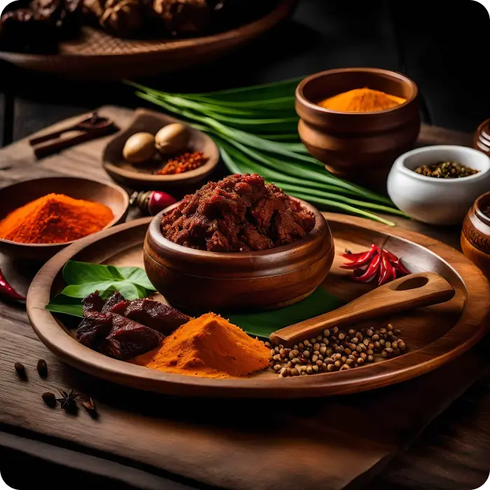 Irisan daging yang lembut dari sapi halal yang diolah dengan racikan bumbu rempah turun-temurun warisan nenek moyang di Minangkabau, Sumatera Barat, Indonesia